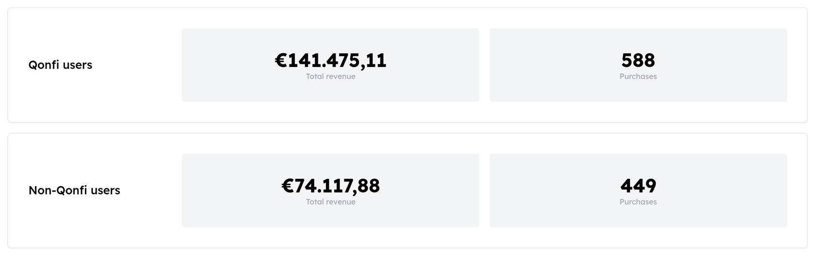 The total purchase and revenue cards let you identify the absolute impact of Qonfi on your performance with respect to revenue and purchases.