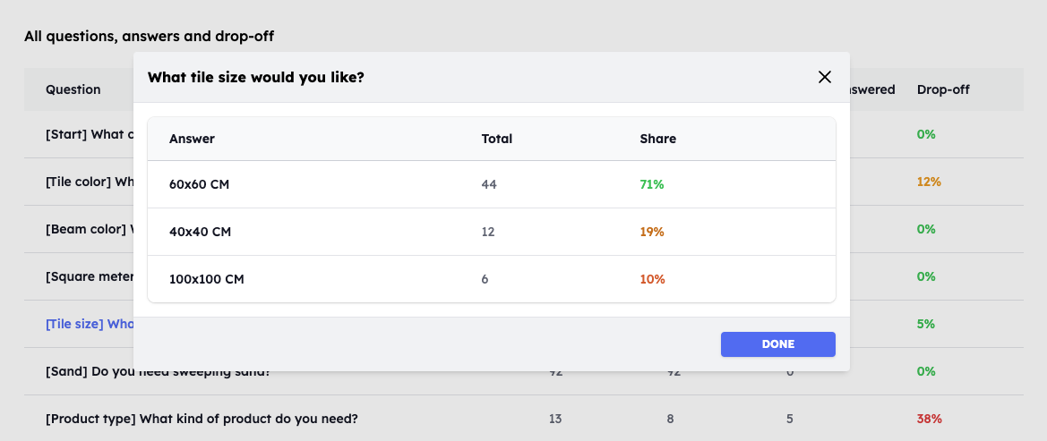 With these insights you can, for instance, decide to increase your product assortment for a particular product property (if you see that most users prefer a certain property and your assortment on this product property is relatively small). You can also change your answers, change or add descriptions or change your questions to optimize your selling guide further.