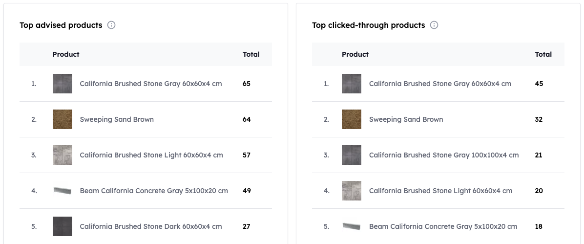 With ‘Top advised products’ and ‘Top clicked-through products’, you can track which products are advised to your users and which products are clicked on the most. For example, you can use this data to optimize your assortment or change your flow to stop recommending items that are rarely clicked on.