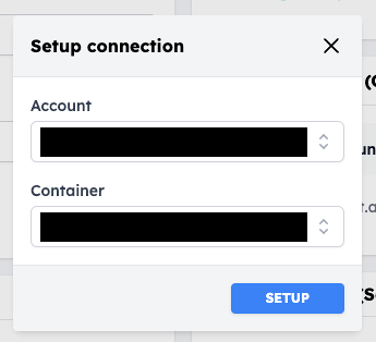 4. After selecting an account and the container, click the "Setup" button to create the required variables, trigger and tag.